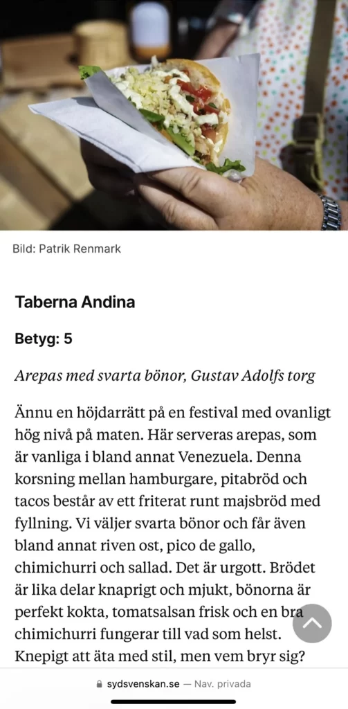 Vår specialitet är arepas, en venezuelansk kebab där det glutenfria brödet är gjort av majsmjöl. Arepas är den perfekta duken för en mångfald av smaker, och vi erbjuder både traditionella fyllningar och våra egna nyskapande kombinationer.
